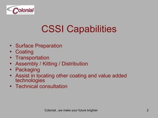 Colonial Surface Solutions provides surface preparation and coating services for various substrates. They offer capabilities such as surface preparation, coating application, transportation, and technical consultation. Their surface preparation methods include abrasive blasting equipment and burn-off ovens. They can apply coatings such as paint, powder coating, iron phosphate, and alodine. Their facilities include large paint booths, powder coating booths, and curing ovens. Colonial Surface Solutions has over 30 years of industry experience and aims to provide customers with production solutions.
