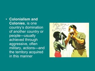 Colonialism involved one country dominating another through military force to establish control over territory and people. There were economic, religious, and strategic motivations for colonialism. Economically, colonies provided markets, raw materials, and investment opportunities. Religiously, countries sought to spread their beliefs. Strategically, colonies protected trade routes and investments. The 1884-85 Berlin Conference regulated European colonization in Africa, eliminating African autonomy and dividing the continent between European powers. Colonial rule had significant negative consequences for colonized peoples through exploitation of resources and labor forces, destruction of local industries, slavery, and institutionalized racism.