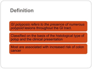 Colonic polyposis refers to numerous polyps throughout the GI tract that are often precancerous. The most common type is familial adenomatous polyposis (FAP), an autosomal dominant condition caused by a mutation in the APC gene. People with FAP develop hundreds to thousands of colon polyps by their mid-30s, and colon cancer is inevitable without surgery to remove the colon. They are also at risk of polyps in the stomach and duodenum that can become cancerous. Treatment involves prophylactic colectomy, surveillance of the upper GI tract, and managing extracolonic manifestations such as osteomas and desmoid tumors.