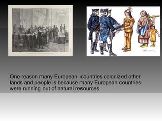 The document discusses the history of European colonization and its consequences. It states that as resources in Europe became depleted and populations grew, European powers like England, France, Portugal and Spain sought to colonize other lands like America for new opportunities. However, the colonization had devastating impacts, resulting in the genocide and enslavement of native populations like the Native Americans. The colonists also brought African slaves to work, especially after native Americans often died in slavery. The document describes colonialism as a violent process that destroyed indigenous groups through death, slavery, and forced relocation to make way for European expansion.