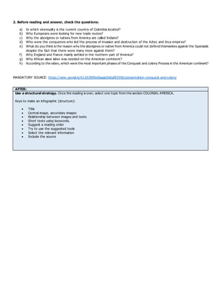 The document provides reading strategies and questions for understanding the influence of European exploration and colonization in America. It asks students to activate prior knowledge on conquest and colonies before reading. During reading, students should select important information, identify the text structure, and answer comprehension questions. After reading, students are asked to summarize a topic from the colonial America section in an infographic, including title, images, short texts using keywords, and sources. The goal is for students to understand the economic and geographic impacts of European territorial expansion and colonization in America.