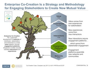 Coloplast set up an online community called Stoma-Innovation.com for ostomy patients to discuss their condition and share product ideas. The site is independently run by community members but funded and observed by Coloplast. Highly active "power users" are invited to a private area to work directly with Coloplast on developing new products. The first commercial product from the community is nearing release. The site illustrates enterprise co-creation by facilitating new experiences and interactions between stakeholders to generate mutual value.