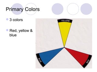 This document defines and describes different types of colors including primary, secondary, tertiary, hue, value, tint, tones, shades, chroma, warm and cool colors. It also discusses different color schemes such as monochromatic, analogous, complementary (direct, split complementary, triadic) and neutral colors. Primary colors are red, yellow and blue. Secondary colors are created by mixing two primary colors, and tertiary colors are created by mixing a primary and secondary color. Other terms like hue, value, tint, tones and shades describe attributes of colors.