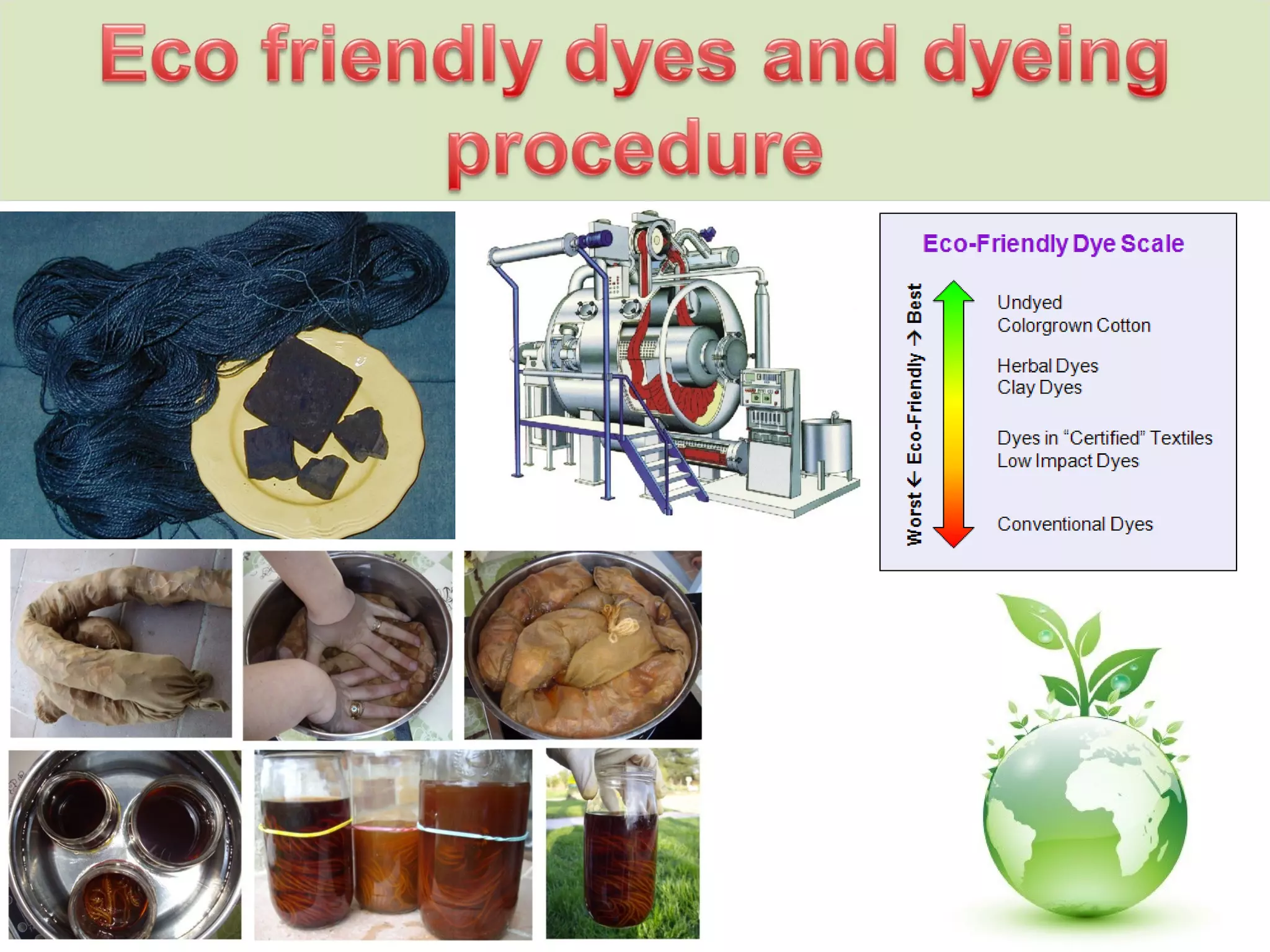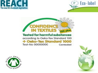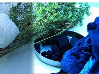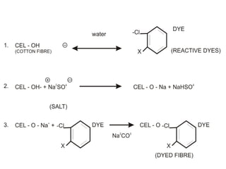 This document provides information about various types of dyes used in the textile industry, including their properties and dyeing processes. It discusses natural dyes extracted from plants as well as synthetic dyes like direct dyes, vat dyes, disperse dyes, and reactive dyes. For each dye type, the document outlines their key properties, how they interact with different fibers, and their advantages and limitations. It also mentions sustainability considerations like limiting chemical usage and following eco-label standards.
