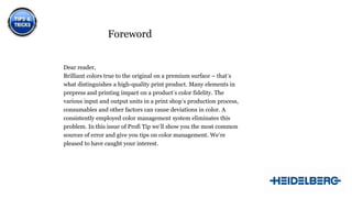 The document outlines the five steps of the color management process crucial for achieving high-quality print products. It emphasizes the importance of selecting the right consumables, optimizing production conditions, and calibrating the printing process to ensure consistent color fidelity. Each step includes detailed guidelines for evaluating and improving print results based on specific parameters and measurements.