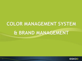 The document outlines a color management system (CMS) that ensures color consistency across various devices and mediums, which is vital for effective brand management. It highlights the benefits of using a CMS, including improved predictability and repeatability in color representation throughout the packaging supply chain. The Esko Color Engine is introduced as a solution that integrates color management into workflows, assisting designers and stakeholders in maintaining brand color standards.