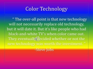 Color technology is widely used in many forms of technology like computers, phones, TVs, and more. A survey found that 80-90% of respondents believe the majority of technology uses color. Color allows for easier use and recognition across different technologies. It can also have positive psychological impacts, as some studies have shown color can help people relax and improve educational experiences by making information more memorable. While new technologies may replace old ones over time, color remains an important aspect of most forms of technology.