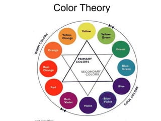 The document discusses color theory and the color wheel. It explains that Sir Isaac Newton first represented the relationship between colors in the form of a circle in 1672 after observing a rainbow through a prism. A century later, Johann Wolfgang von Goethe studied how different colors evoke different emotions. The color wheel is divided into primary, secondary, and intermediate colors. It also describes color schemes such as monochromatic, complementary, analogous, warm, and cool colors. Monochromatic uses one color, while complementary and analogous use colors relative to each other on the color wheel.