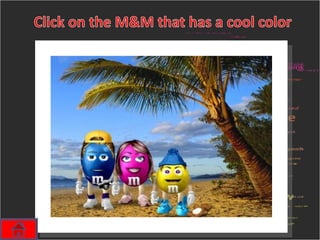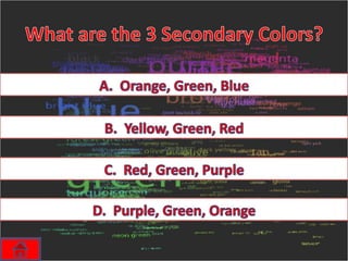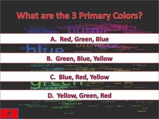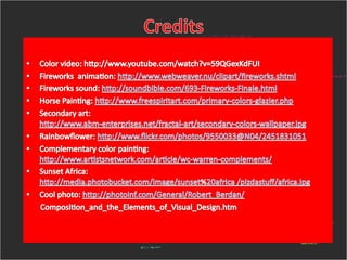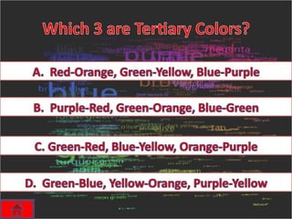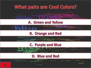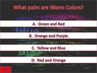 The document discusses different types of colors including primary colors (red, yellow, blue), secondary colors (orange, green, purple), tertiary colors which are mixes of primary and secondary, analogous colors which are next to each other on the color wheel, complementary colors which are across from each other, warm colors like red and yellow, and cool colors like blue and green. It provides examples of each color type and includes an objective and quiz.