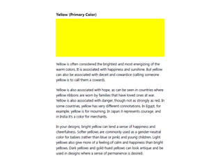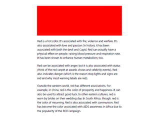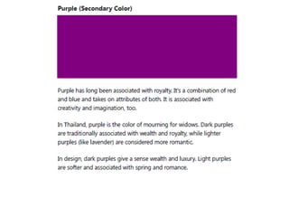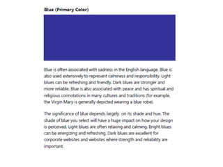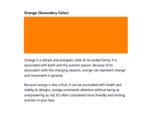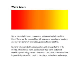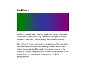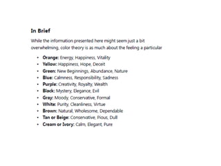 This document discusses color theory and color schemes. It begins by explaining how color receptors in the eye perceive different colors and how colors can be mapped to a color wheel. It then defines terms like hue, saturation, brightness, tint, shade, and tone used to describe colors. Finally, it outlines several common color schemes - monochromatic, analogous, complementary, triadic, square-tetradic, accented, warm, and cold - and provides an example of a double-complementary palette used on a website.