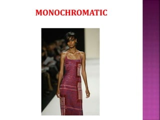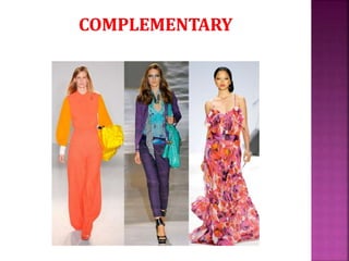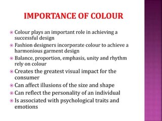 This document discusses colour theory and colour schemes. It explains that colour plays an important role in design through elements like balance, proportion and emphasis. It defines primary, secondary and intermediate colours, as well as neutral colours. It then describes four common colour schemes: monochromatic, analogous, complementary and triad. It provides examples of each scheme and discusses how different colours can affect moods and perceptions.