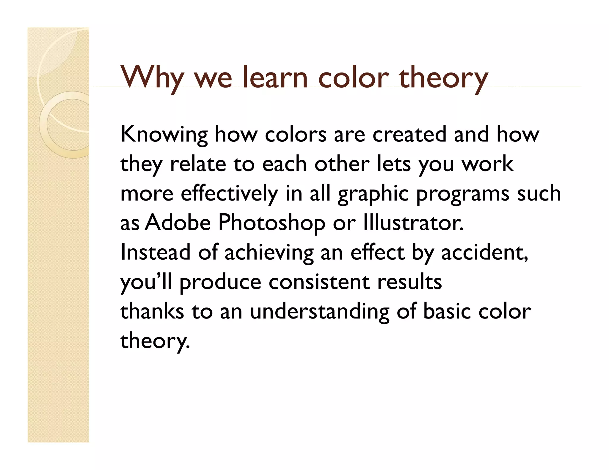 Knowing color theory allows users to work more effectively in graphic programs like Photoshop and Illustrator. Understanding basic color theory produces consistent results rather than achieving effects by accident. Color theory involves understanding how colors are created and how they relate to each other.