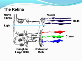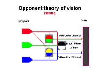 The document provides a detailed overview of color vision, including the definition, types, and physiological processes involved in color perception. It discusses color theory, including the trichromatic and opponent colors theories, as well as the perception of hues, brightness, and saturation. Additionally, it addresses color vision deficiencies and their classifications.