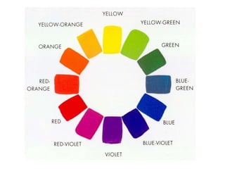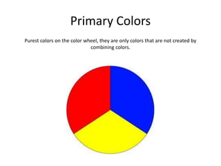 The document discusses color theory and the color wheel. It explains that primary colors cannot be created by combining other colors, secondary colors are made by mixing two primary colors, and tertiary colors are a mix of a primary and secondary color. It also defines neutral colors that are not on the color wheel but used in mixing, and describes values like shade, tone, hue and tint which relate to the lightness, darkness, and mixing of colors.