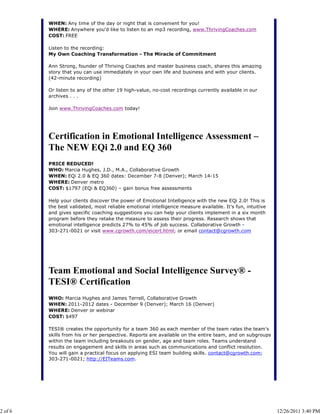 The document outlines various coaching services, programs, and resources available for Colorado's coaching professionals, including free recordings, certification courses, and advanced skills training. It provides details on multiple offerings such as emotional intelligence assessments and mentoring programs, along with costs and schedules. Additionally, it mentions advertising opportunities within the publication for related services and events targeting coaches.