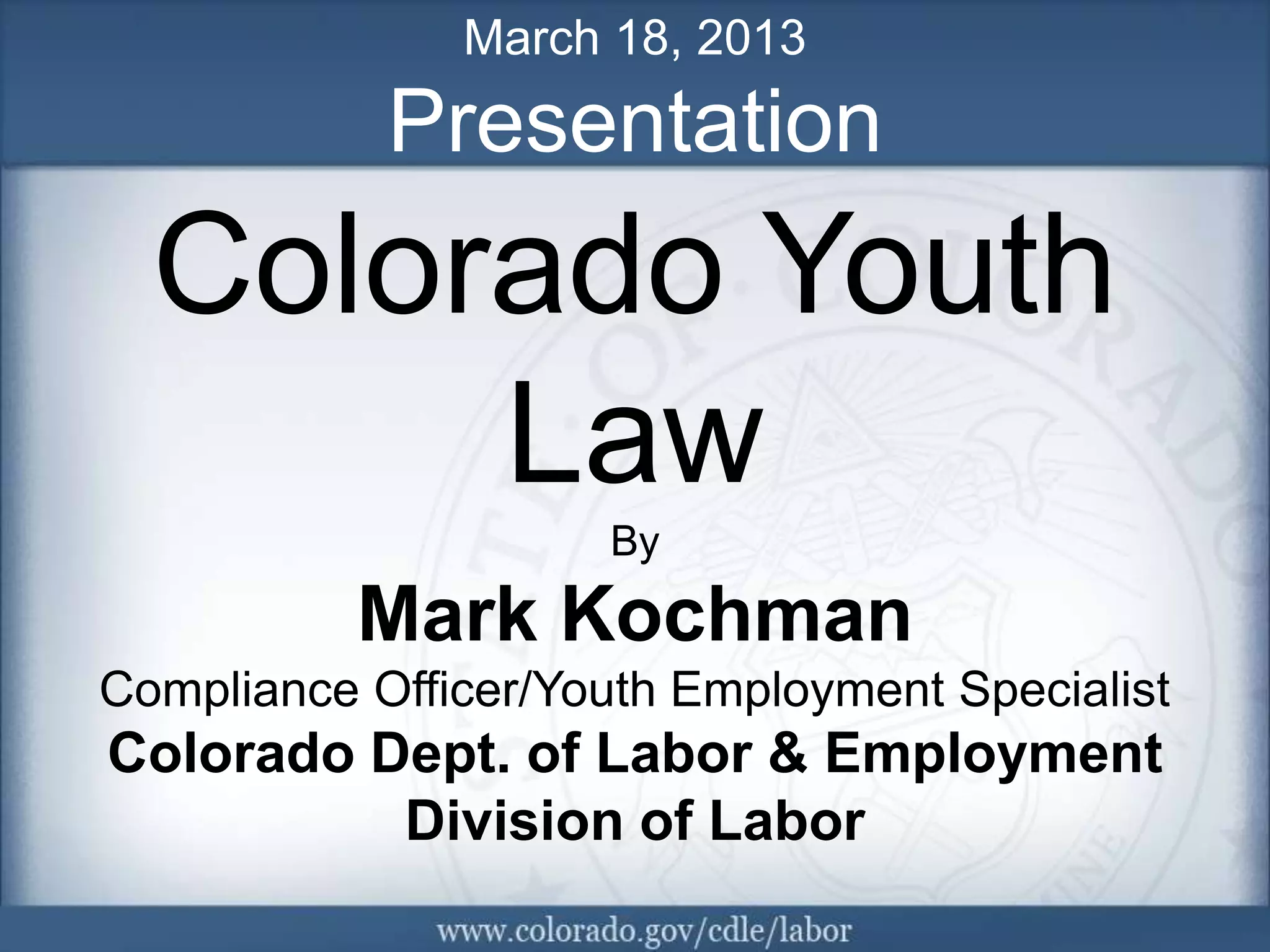 This presentation provides an overview of Colorado Youth Law, which regulates the employment of minors in the state. It discusses key aspects of the law such as minimum wage rates, work hour limitations, permissible jobs for different age groups, and exemptions. Colorado Youth Law sets work restrictions to protect minors, but allows exemptions to be granted on a case-by-case basis based on a minor's experience and safety. Questions about the law can be directed to the Colorado Department of Labor and Employment.