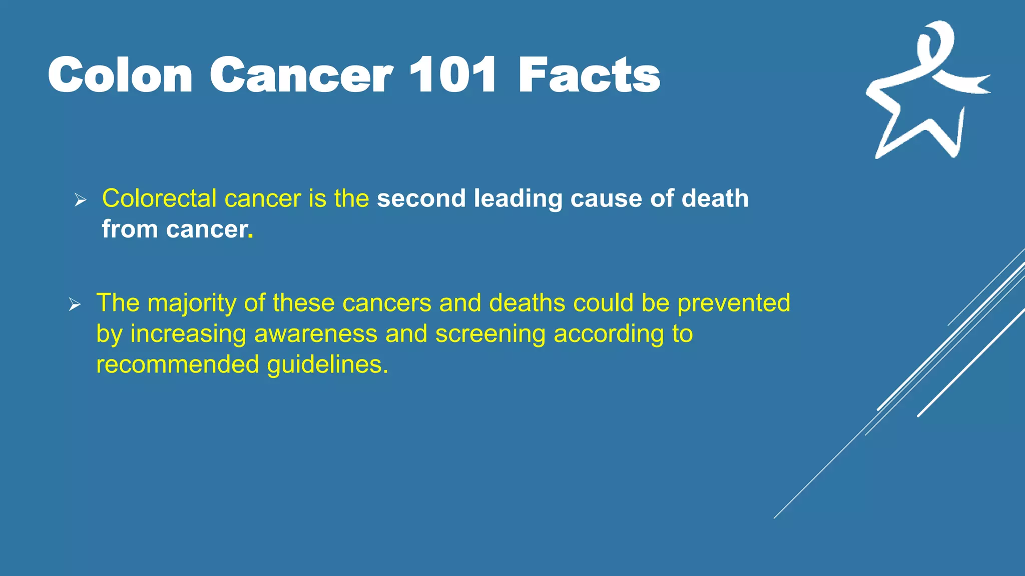 Colorectal cancer is the second leading cause of cancer death, with many cases preventable through awareness and screening guidelines. Risk factors include diet, physical inactivity, age, and family history, among others. Early detection through regular screenings is crucial for effective treatment, and those aged 45-75, especially with risk factors, should be screened regularly.
