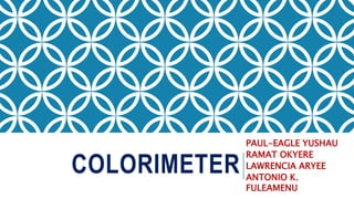 The document provides information about a colorimeter. It begins with an introduction to colorimeters, noting they measure light intensity and were invented in 1870. It then describes the basic principle that colorimeters measure light absorbed by colored solutions according to Beer's and Lambert's laws. The document outlines the typical parts of a colorimeter like its electronics and sample compartment. It discusses preparing blank, standard, and test solutions and explains Beer's and Lambert's laws. The document concludes by covering common colorimeter applications in clinical labs and industries like using them to estimate biochemical compounds in various samples.