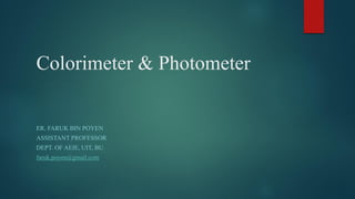 The document provides an overview of colorimeters and photometers, detailing their definitions, principles, components, pros and cons, and working principles of different types. Colorimeters are used to measure the absorbance of light in colored solutions based on the Beer-Lambert law, while photometers measure light intensity and can operate across various spectra. It also distinguishes between colorimeters and spectrophotometers in terms of their functionality and wavelength ranges.