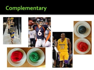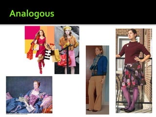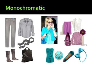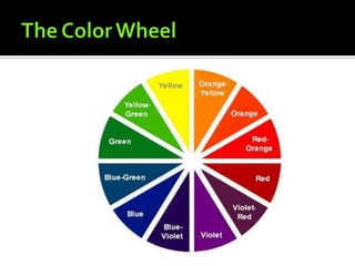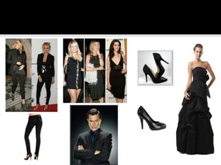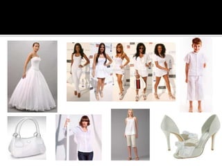 The document discusses color theory and the psychological and emotional effects of different colors. It explains key color theory terms like hue, value, tint, shade, intensity and neutrals. It then analyzes the properties and symbolic meanings of different colors including white, black, red, yellow, blue, green and pink. Apparel choices in these colors are suggested based on their visual effects and emotional associations.
