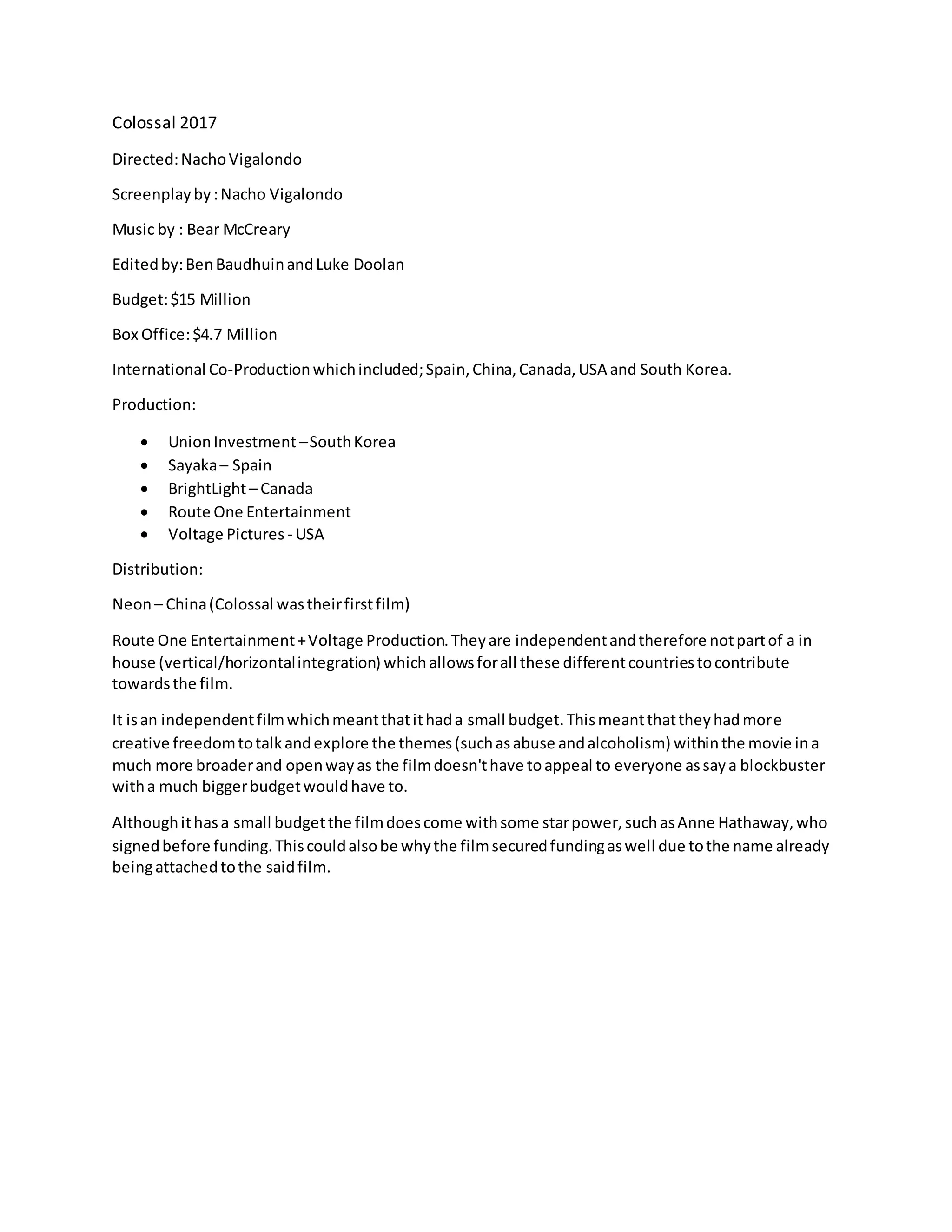 Colossal is an international co-production directed by Nacho Vigalondo that tells the story of a woman struggling with alcoholism. It had a budget of $15 million and earned $4.7 million at the box office. The film was produced by companies in South Korea, Spain, Canada, the United States, and China, allowing it to receive funding from multiple countries while maintaining creative independence as an independent film.