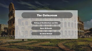 The Colosseum in Rome underwent many changes over time. Originally built under Emperor Vespasian and opened by his son Titus in 80 AD, it could hold up to 70,000 spectators and featured four levels of seating. The social status of spectators determined where they sat, with elites closest to the arena. Made of stone, brick, concrete and wood, it had both an exterior facade with three levels of arches and an underground area to hold gladiators and animals. Over centuries it declined but still stands as one of the most impressive remains of Roman engineering and architecture.