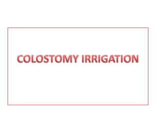 This document discusses colostomy care and procedures. It defines a colostomy as an artificial opening in the large intestine brought to the surface of the abdomen. It then classifies colostomies as either temporary or permanent, and by stoma site or number/type. Common indications for a colostomy include colon cancer, Hirschsprung's disease, and ulcerative colitis. The purpose of colostomy care is to protect the skin, provide drainage, clean and regulate the bowel, and enable patient self-care. Required equipment includes supplies for changing appliances and bags, as well as accessories like filters, tape, soap, and gloves. Colostomy irrigation is defined as introducing a solution through the