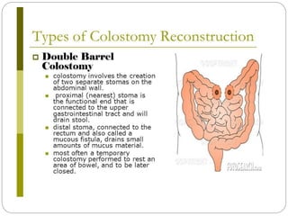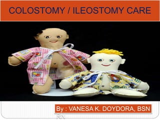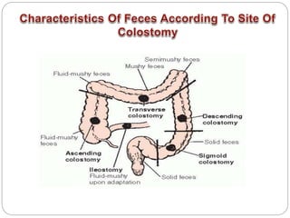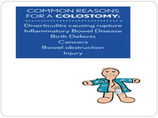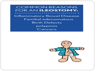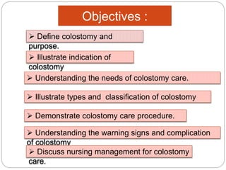 This document provides information on colostomy and ileostomy care procedures. It defines a colostomy as a surgical procedure that creates a stoma by bringing part of the bowel through an abdominal wall incision. This bypasses or removes injured or diseased bowel. The document outlines the types and classifications of colostomies, as well as the steps for changing a colostomy pouch, potential complications, and nursing management goals. The purpose is to educate on proper colostomy care techniques and identify warning signs.
