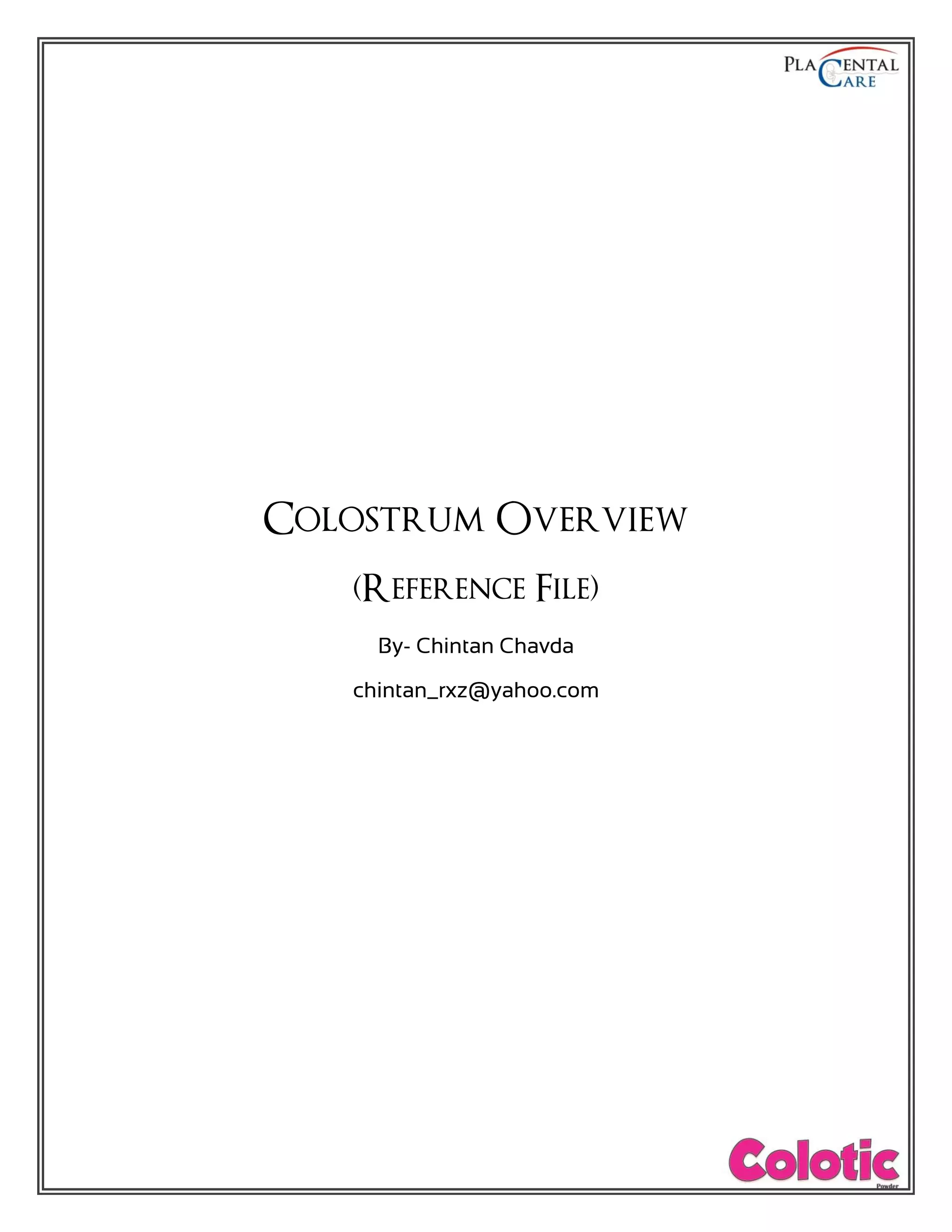 Colostrum is the pre-milk fluid produced by mothers at birth. It is low in volume but high in nutrients and antibodies to protect newborns. Bovine colostrum contains over 90 components including immune factors like immunoglobulins and growth factors that help build tissue, increase muscle, and support healing. It also contains vitamins, minerals, amino acids, and other nutrients that are easy for babies to digest and provide concentrated nutrition and immunity.