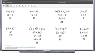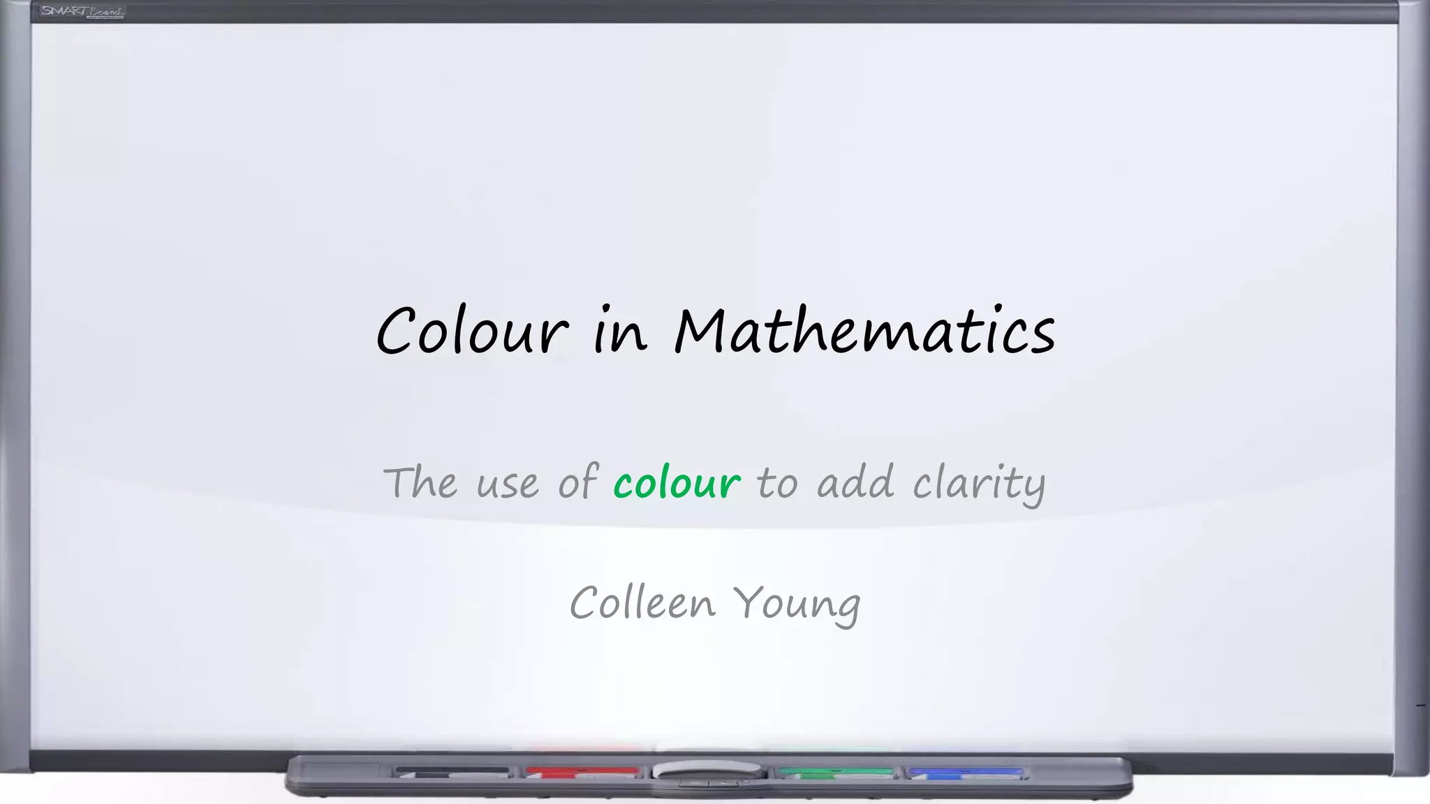 The document discusses how colour can be used in mathematics to add clarity. It provides examples of how colour highlights which terms are associated with signs in algebra examples. Colour can also emphasise the order of operations. Further examples show how colour aids understanding of topics like factorisation, composite functions, inequalities, coordinate geometry, binomial expansion, completing the square, circle geometry, integration, and decision mathematics algorithms. Worked solutions with colour coding are also suggested to help students understand steps at their own pace.