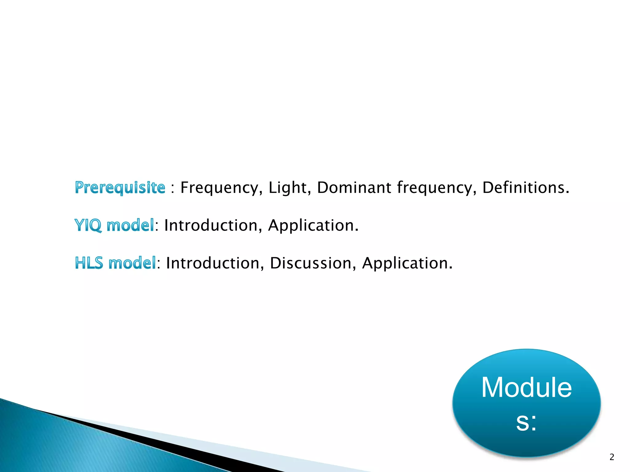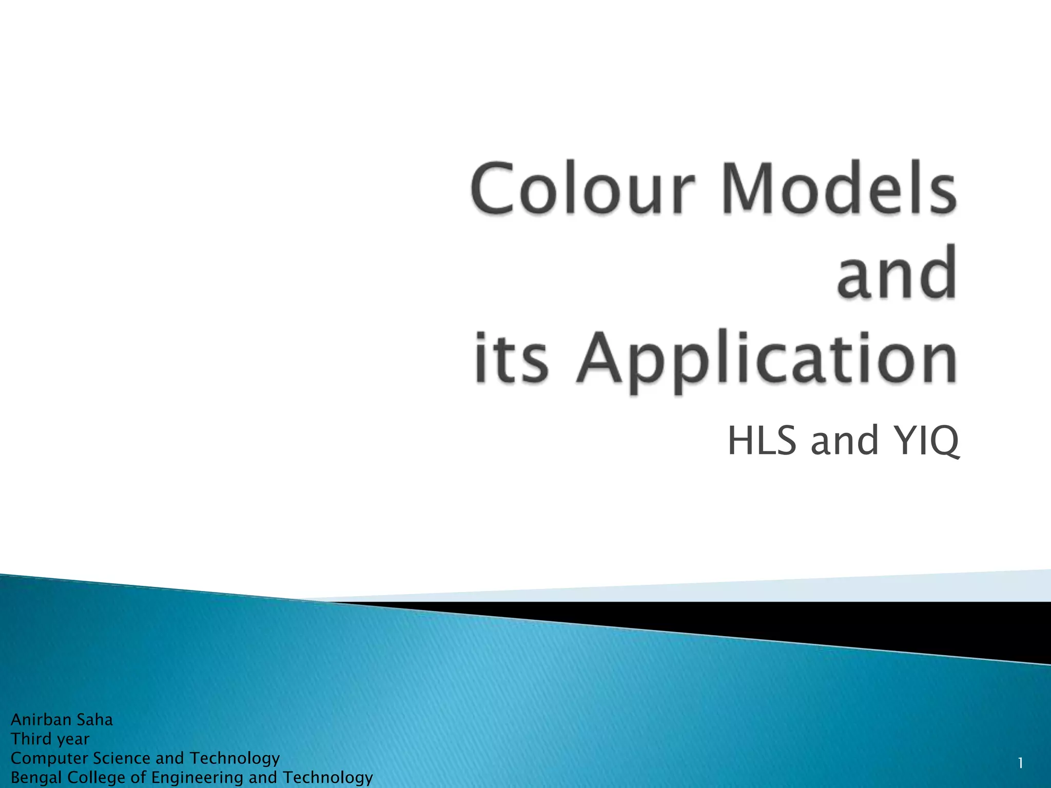 The document discusses color models including HLS and YIQ. It provides background on visible light wavelengths and introduces the YIQ and HLS color models. The YIQ model with Y for luminance, I for in-phase, and Q for quadrature was used in analog television to transmit color information using one signal. The HLS and HSV models represent color as Hue, Lightness/Value, and Saturation in a double hexagonal cone with white at the top and black at the bottom to better match human color perception compared to the RGB model. The models have applications in color selection, comparison, editing and image analysis.