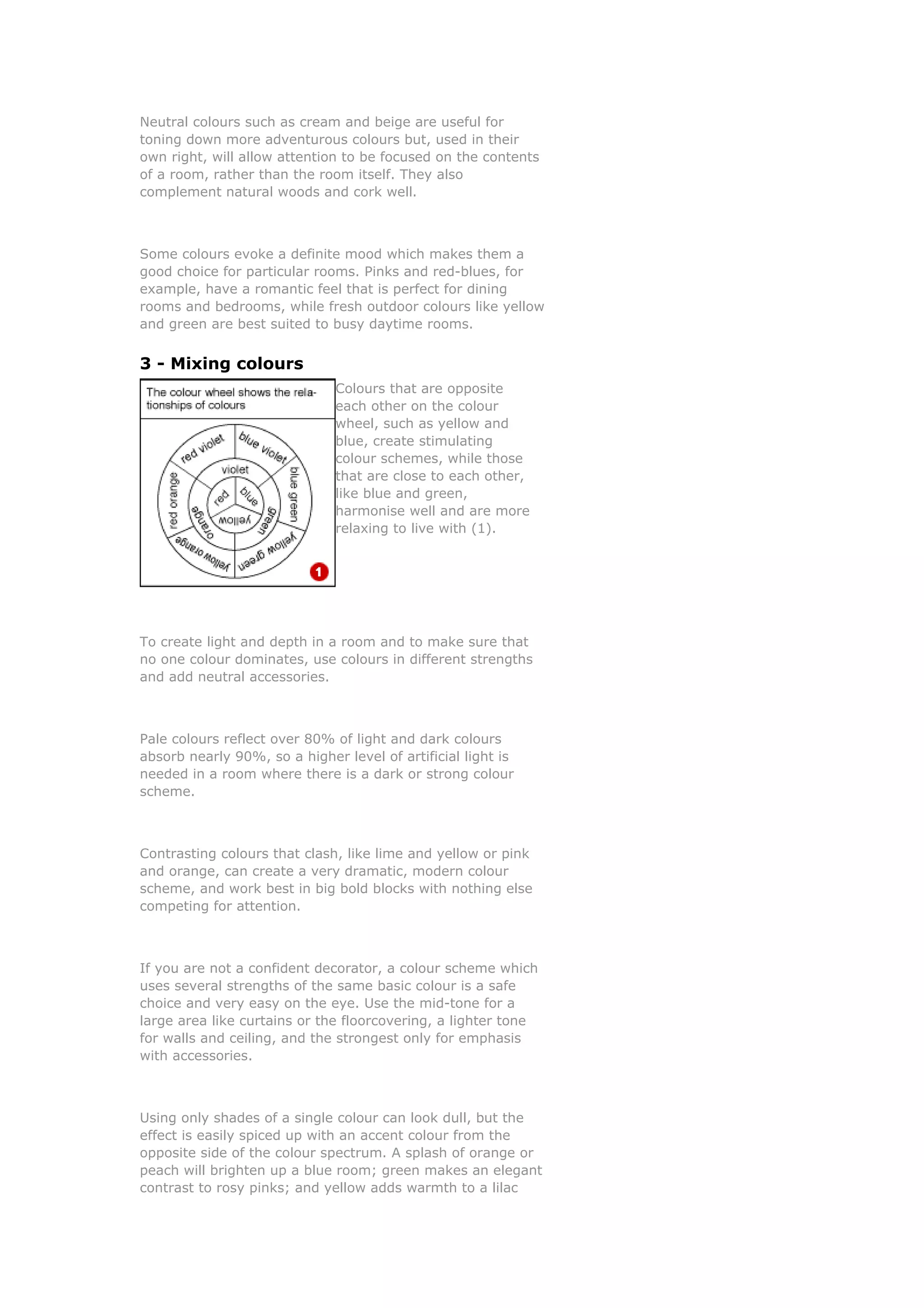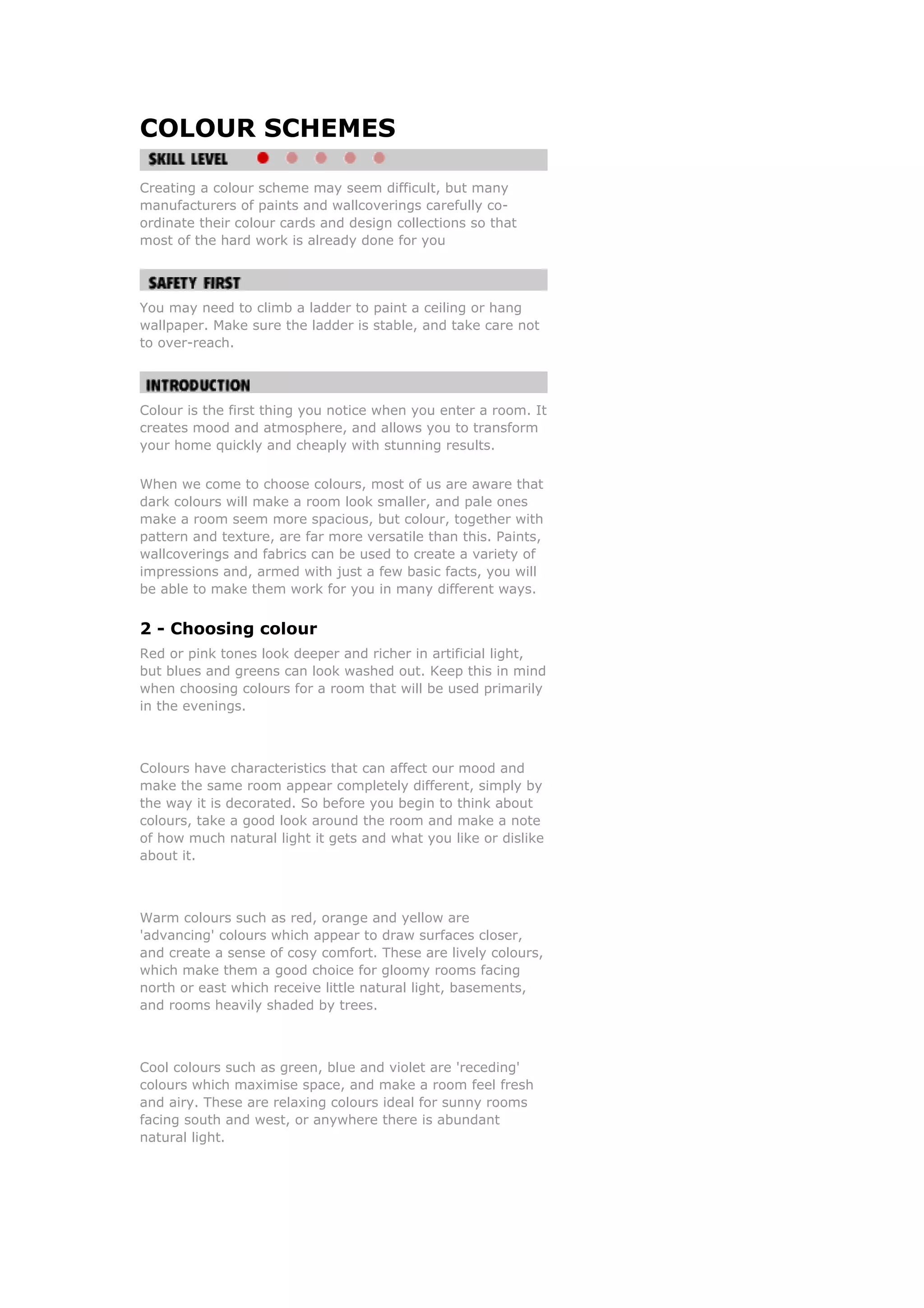 Creating a colour scheme for a room can transform it quickly and cheaply. It is important to consider factors like the amount of natural light a room receives and how colours can affect mood. Warm colours like red and yellow make small, dark rooms feel cozier while cool colours like blue and green are relaxing and make rooms feel more airy. When choosing colours, consider how they may look different in artificial light compared to natural light. Patterns can also be used to make optical illusions and change how a room appears. Texture adds visual interest and different textures like wood or brick feel warmer while shiny surfaces seem more sophisticated. Accessories should be updated to match a new colour scheme for a polished look.