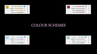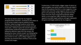 The document discusses the color scheme selection process for a rock music magazine. The author chose to use gold as the primary color based on the results of a survey of the target audience. Gold received the most votes and represents the genre of rock music. It also alludes to a classic 1980s song appealing to the older target demographic. Burgundy and light blue were also considered but did not stand out as much against the background colors.