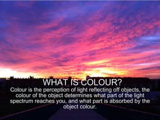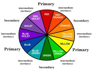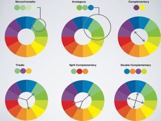 This document discusses color theory and the key elements used to describe color. It covers topics like hue, value, saturation, color temperature, primary colors, secondary colors, tertiary colors, color harmony, monochromatic schemes, analogous schemes, complementary schemes, triadic schemes, split complementary schemes, and how color is perceived differently based on context.