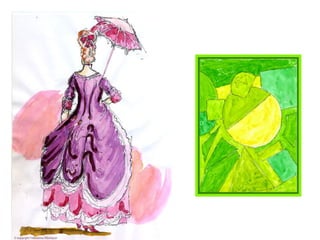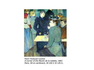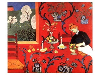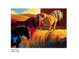 This document provides an overview of colour theory, including definitions of primary, secondary, and tertiary colours; complementary colours; saturation and value; warm and cool colours; colour harmonies like monochromatic, analogous, and split complementary; and concepts like simultaneous contrast, tonality, and emotional responses to colour. It also lists several artists and artworks as examples.