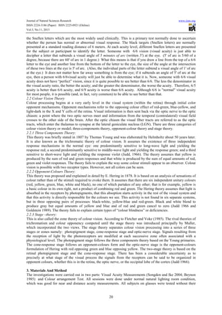 The document summarizes a study that investigated colour vision performance through visual acuity and colour arrangement tests. 8 participants had their visual acuity measured using Snellen letters and were then asked to arrange 42 colour targets into groups based on colour and saturation. Most participants were able to correctly arrange the colours, though a few made minor mistakes by interchanging targets within colour groups. The results confirmed that good visual acuity is necessary but not sufficient for good colour vision performance.