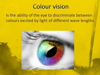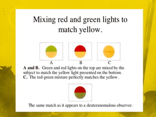 This document discusses color vision and color blindness. It begins by describing the three types of cones in the eye that are sensitive to long, middle, and short wavelengths of light, corresponding to red, green, and blue colors. It explains that color vision is achieved through the trichromatic theory, with colors resulting from different combinations of the three primary colors stimulating the cones. The document also discusses color opponent processing and color blindness, outlining different types like dichromacy and anomalous trichromacy that affect color perception. Tests for color blindness like Ishihara plates are also mentioned.
