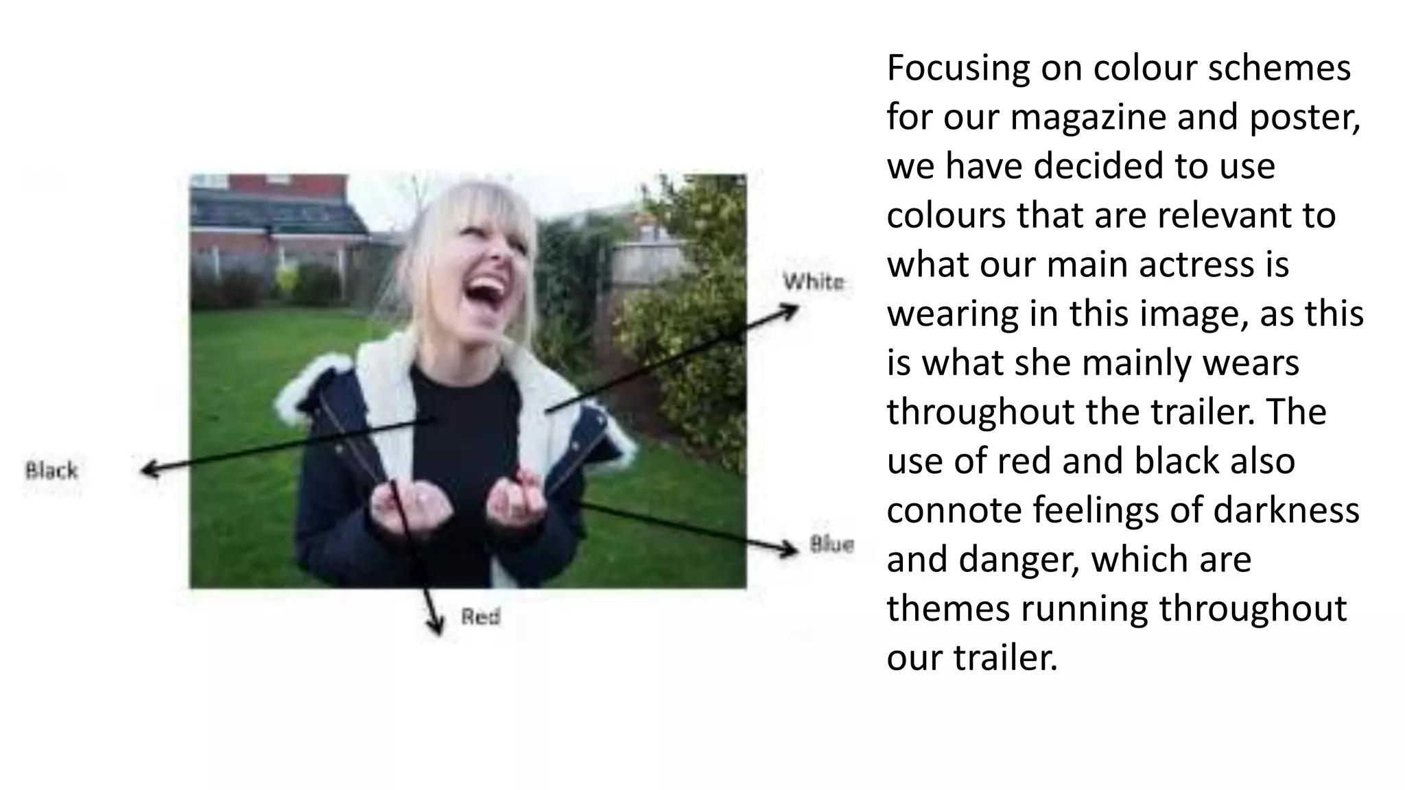 The document discusses colour schemes for a magazine and poster promoting a film. It focuses on using colours that are relevant to what the main actress wears in scenes from the film's trailer. Red and black are chosen as they connote feelings of darkness and danger, which are themes in the trailer. Blue, white, red, and black are then discussed in more detail. Blue represents depth, stability, and positive themes. White symbolizes light, goodness, and innocence. Red stimulates emotion and passion. Black is associated with power, death, evil, and mystery.