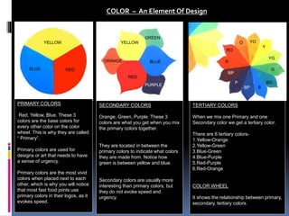 Primary colors are red, yellow and blue. They are the base colors that make up all other colors on the color wheel. Primary colors are used for designs that need urgency or speed, which is why fast food logos often use them. Secondary colors are orange, green and purple, which are created by mixing primary colors. Tertiary colors are made by mixing a primary and secondary color, such as yellow-orange. The color wheel shows the relationships between primary, secondary and tertiary colors.