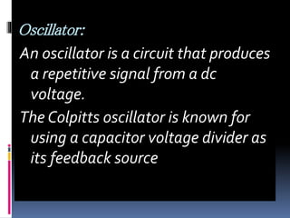 The Colpitts oscillator is a type of oscillator that uses an LC circuit in the feedback loop. The feedback network is made up of two capacitors (C1 and C2) tapped on an inductor L. The output voltage is developed across C1, while the feedback voltage is developed across C2. For oscillations to occur, the loop gain must be greater than unity. Colpitts oscillators have good wave purity and stability at high frequencies, making them well-suited for applications like communication circuits and frequency sources. However, they can be difficult to design and have poor isolation between load impedance and oscillation frequency.
