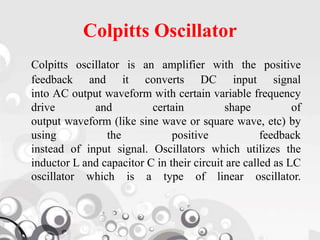The document describes the Colpitts oscillator circuit. It consists of an LC tank circuit made of capacitors and an inductor that produces sustained oscillations. The capacitors provide positive feedback to sustain oscillations at the resonant frequency of the tank circuit. It works by the energy transferring between the capacitors and inductor in the tank circuit. The Colpitts oscillator can generate high frequency sinusoidal waves and is commonly used as a local oscillator in radio receivers [END SUMMARY]