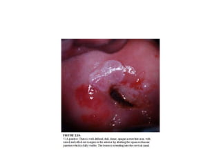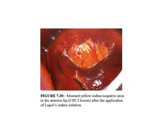 Colposcopy is a procedure that uses magnification and acetic acid/Lugol's iodine to examine the cervix. It can detect precancerous lesions and cancers. The key steps are applying acetic acid and iodine to visualize lesions, which appear white or yellow. Biopsies are taken from abnormal areas. For pregnant patients, extra care must be taken to avoid bleeding and injury during the procedure. Lesions suspicious for cancer must still be biopsied.