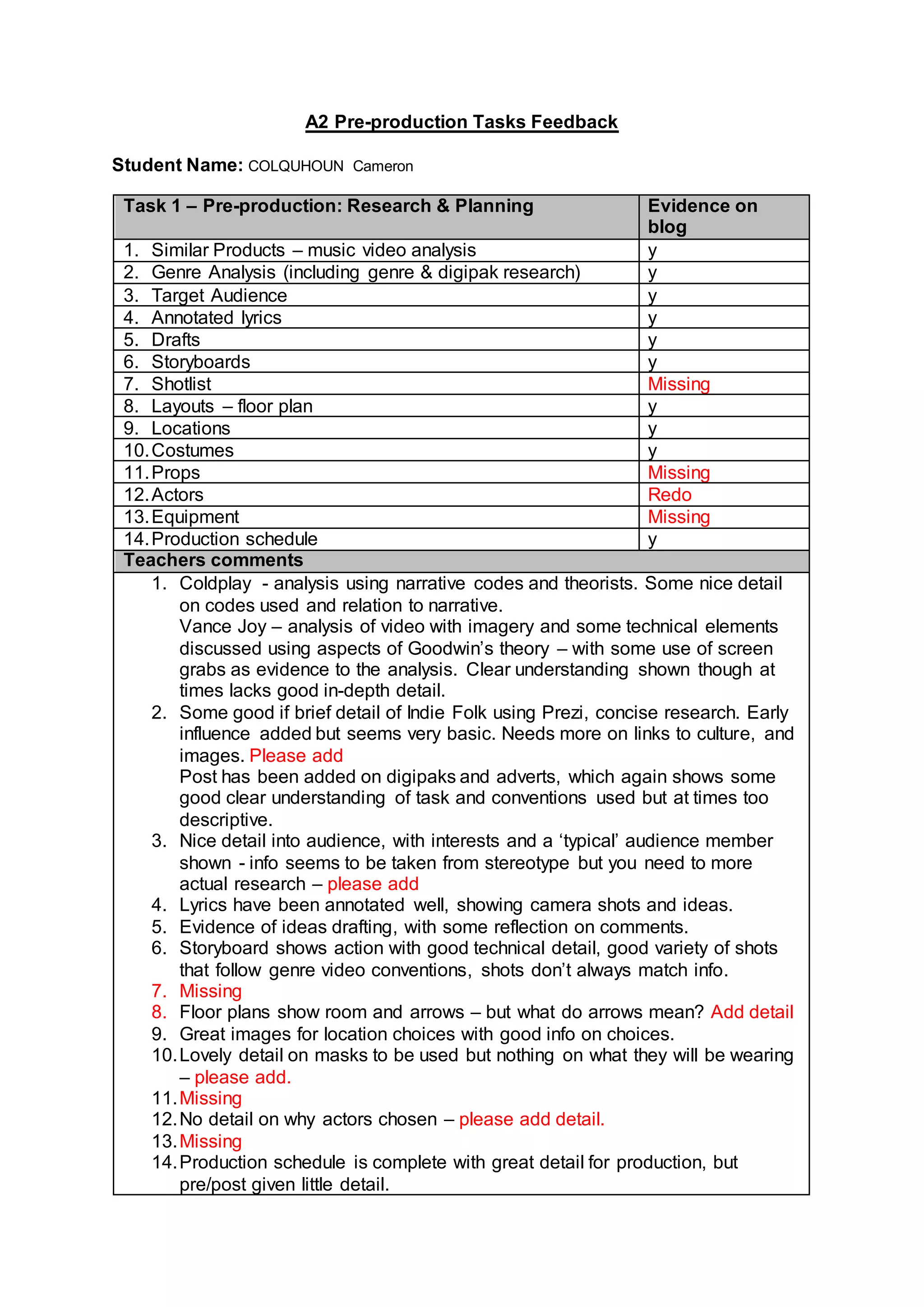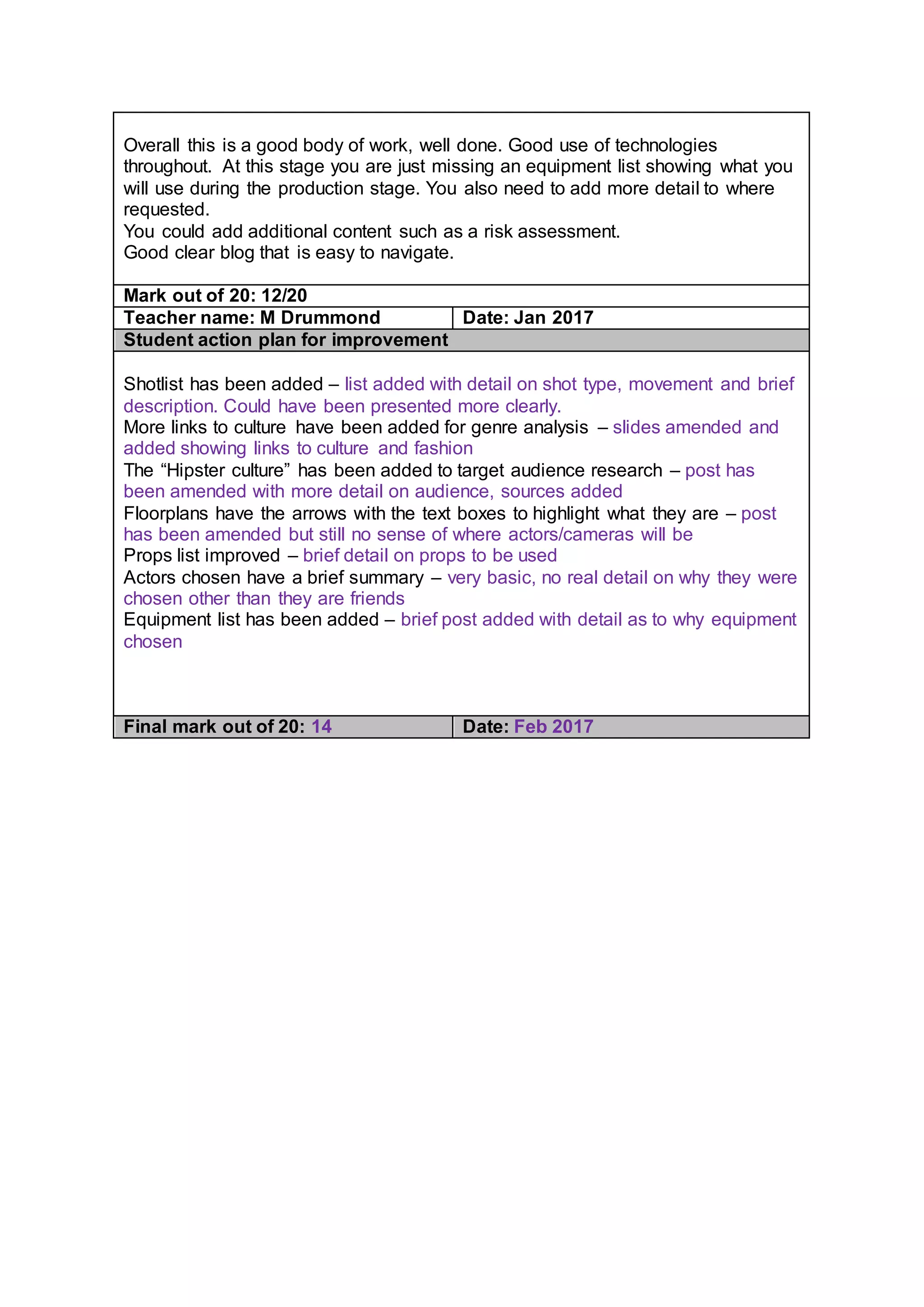 This document provides feedback on a student's pre-production work for a music video project. The teacher comments that the student's research and planning is generally good, but requires more detail in some areas. Specifically, the student needs to add a shotlist, more details on genre analysis and target audience, explanations for arrows on floorplans, more details on props and actors, and an equipment list. The student created an action plan to address these areas, but some improvements could still be made. The teacher awarded the work a final mark of 14 out of 20.