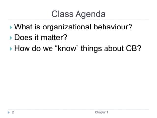 Organizational behaviour (OB) is defined as the field devoted to understanding and improving the attitudes and behaviors of individuals and groups in organizations. The chapter introduces OB and discusses how knowledge in the field is developed scientifically. Key points covered include: