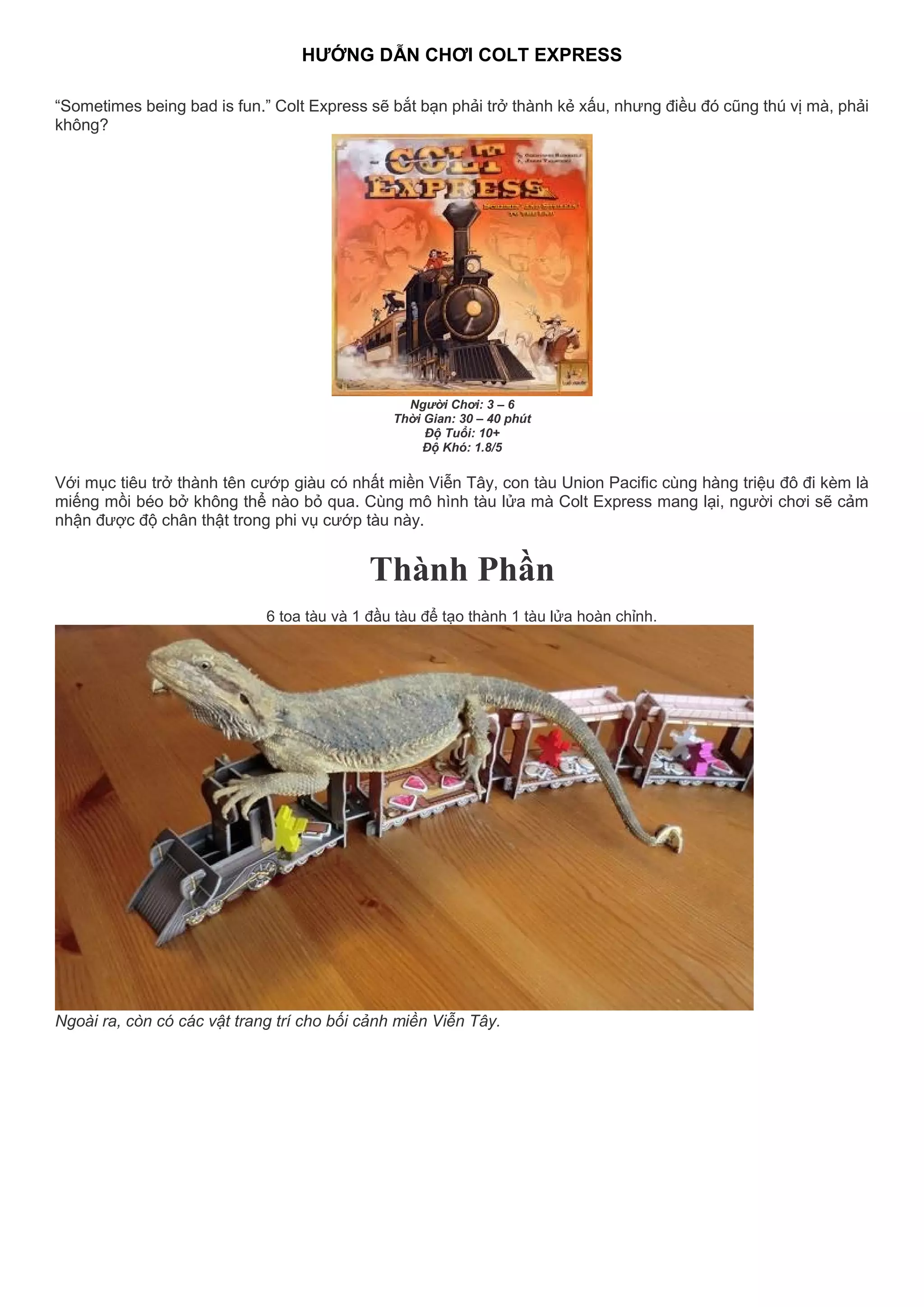 Colt Express là trò chơi cướp tàu cho 3-6 người chơi, với thời gian chơi từ 30-40 phút và độ khó 1.8/5, nơi người chơi cạnh tranh để trở thành tên cướp giỏi nhất miền viễn tây. Trong trò chơi, người chơi sẽ lên kế hoạch hành động và thực hiện các cuộc cướp bóc trên tàu, sử dụng các lá bài hành động và tương tác với các nhân vật khác. Trò chơi kết thúc sau 5 vòng, và người chơi thắng sẽ là người có nhiều tiền nhất, với các quy tắc thưởng cho những người bắn chính xác nhất.