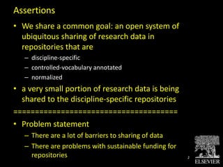 The document summarizes a presentation about how Elsevier could help with research data management. It outlines barriers to data sharing, and proposes that Elsevier can help by applying rigorous metadata processes, leveraging discipline-specific expertise, and developing sustainable funding models for open data repositories through services like analytics subscriptions. The presentation also discusses potential pilots for collecting and standardizing data using apps and dashboards, and annotating data with taxonomies to increase discoverability and credit for researchers.