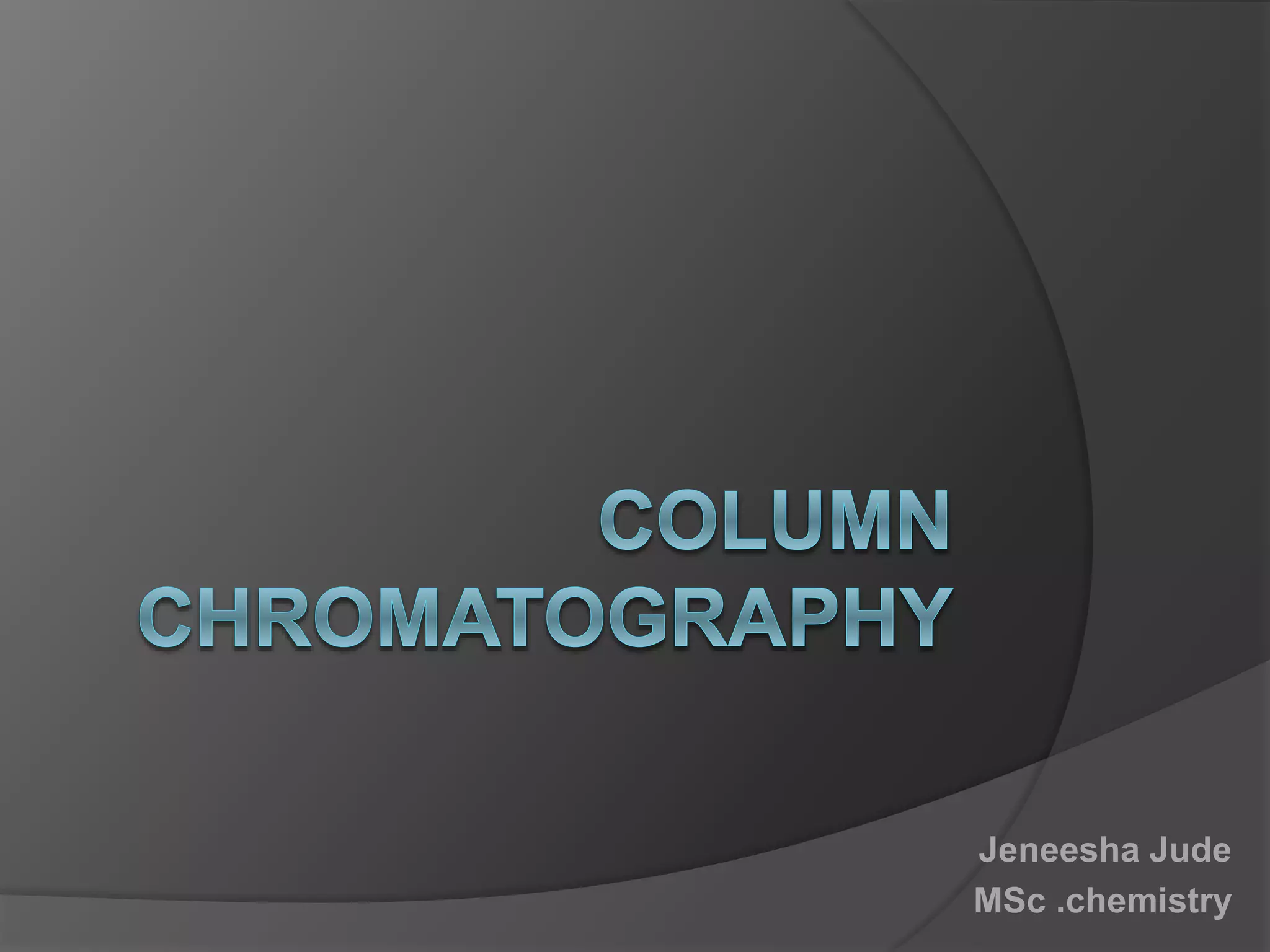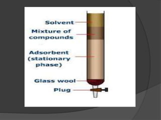 This document discusses column chromatography, a technique used to separate mixtures of compounds. It involves using a stationary phase, typically an adsorbent material like silica gel or alumina, packed into a glass column. A mobile liquid phase is passed through the column, carrying the sample mixture. Components of the mixture are separated based on differences in how strongly they interact with and adhere to the stationary phase. Key factors in column chromatography include selecting an appropriate stationary phase and mobile phase based on the compounds' properties. The document outlines experimental aspects like suitable adsorbents, packing techniques, and applications of column chromatography in separating mixtures.