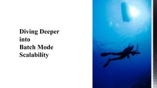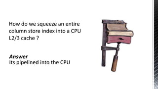 This document discusses SQL Server performance tuning with a focus on leveraging CPU caches through column store compression. It explains how column store compression can bridge the performance gap between IO subsystems and modern processors by breaking data through levels of compression to pipeline batches into CPU caches. Examples are provided showing significant performance improvements from column store compression and clustering over row-based storage and no compression.