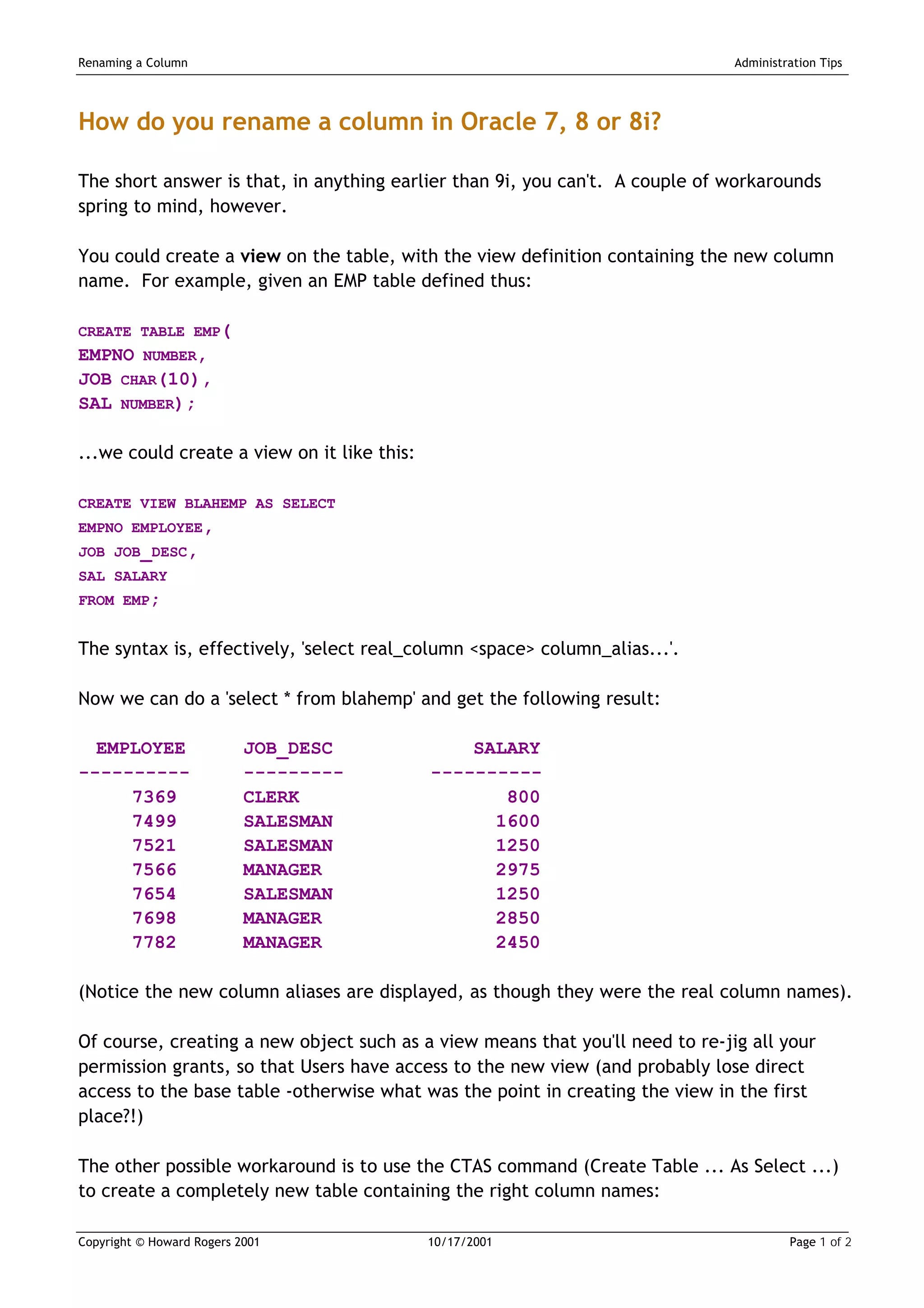 In Oracle versions prior to 9i, a column cannot be renamed directly; however, workarounds include creating a view with the new column names or using the CTAS command to create a new table with desired names. The view method requires adjusting user permissions, while the CTAS method necessitates dropping the original table, which can lead to significant data management overhead. Both methods come with their own challenges, such as the potential for full table scans and the need to re-establish constraints and permissions.