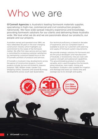 O'Connell Agencies is Australia's leading supplier of formwork materials, specializing in high-rise, commercial, and civil construction projects nationwide. They have over 30 years of experience in the construction industry and provide formwork solutions using their proprietary PVC tube product, Ocatube. Ocatube is a lightweight, durable, and versatile material used for applications like structural columns, piling, infrastructure, and more. O'Connell Agencies prides itself on its technical expertise, high quality products and services, and commitment to customer satisfaction.
